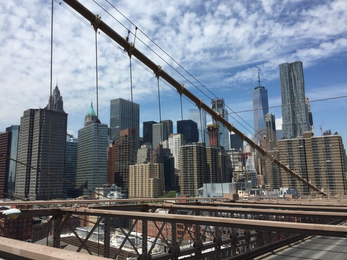Kristin y yo partimos raudos, pues había que recorrer prácticamente toda la isla, de sur a norte en un día. Nuestra primera parada sería el puente de Brooklyn. Tomamos la línea 6 del metro y bajamos a un costado del City Hall. El día era soleado, pero no hacía mucho calor. Era el día perfecto para pasear. Yo traía mis lentes Ray Ban falsos de 100 pesos puestos y una especie de colita en el cabello y me sabía ridículo, pero me importaba poco. Nos unimos al río de turistas que avanzaban hacia el puente y de pronto me descubrí cantando New York, New New York y me sentí un cliché tan obsceno que me ruboricé.