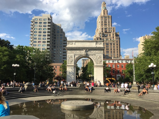 Salimos a la calle y Rolf nos guio hacia el bar donde se haría la lectura de poesía organizada por V. En el camino, tomamos una vía alterna para pasar por Washington Park, el parque donde se erige el famoso arco de Friends (ya sé que su significación es más grande que Friends, lector, pero, no te hagas, tú también lo conoces por Friends). Atravesamos el parque, ese curioso claro de la ciudad, donde las personas se relajaban, caminaban, patinaban (a pesar de los letreros que prohibían patinar).